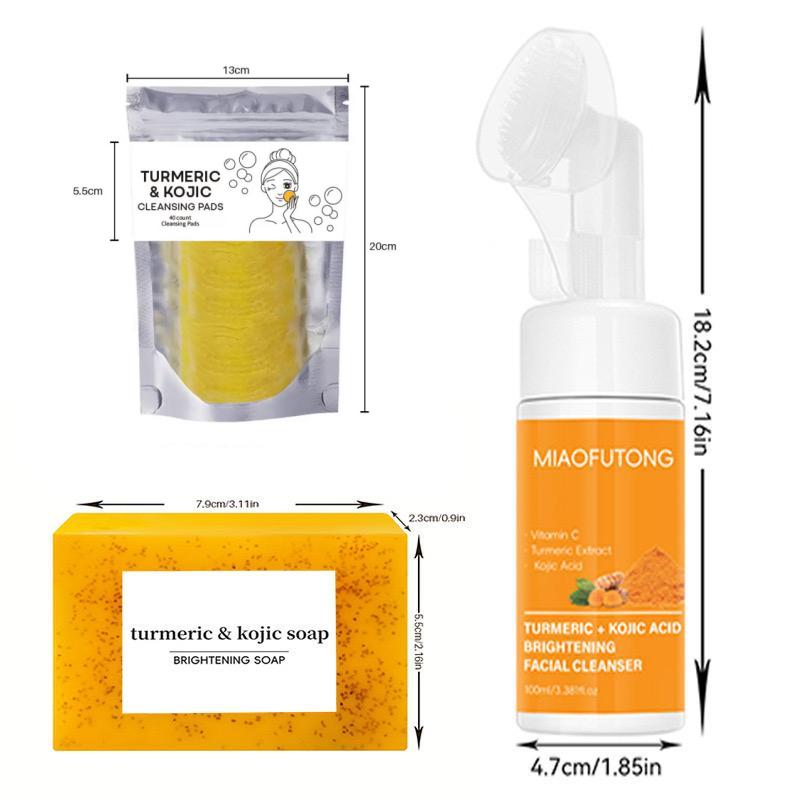 • 2025年の新しいターメリックウォッシュ&ケア 3 Piece Setです。ムース、ターメリックソープ、フェイシャルクレンジングが含まれています。洗顔用のソープとクレンジングが提供されます。